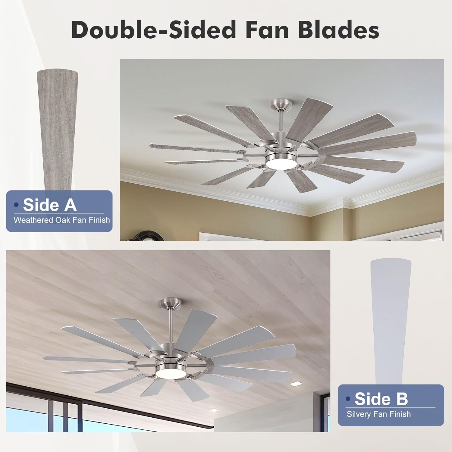 | Room Type | 8/12/24 inch down-rod for low/medium/high ceiling, Indoor ceiling fan for bedroom living room kitchen shop commercial factory garage dining room office, Outdoor ceiling fan for patios porch deck garden gazebo balcony pavilion |
