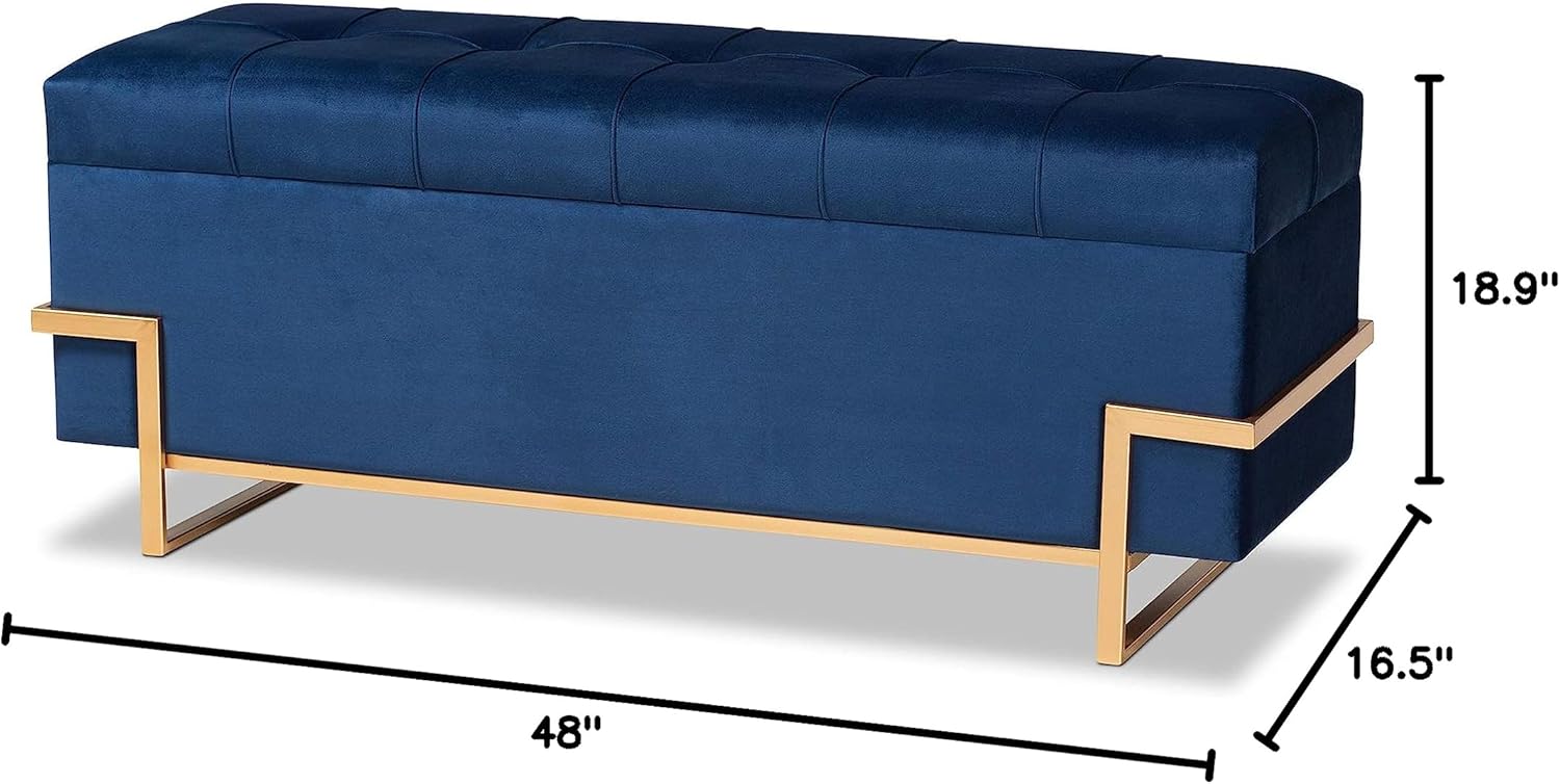 Upgrade your space with the glamorous seating and practical storage offered by the Parker storage ottoman. Made in China, the Parker is comprised of a sturdy wood frame padded with foam and upholstered in smooth navy blue velvet fabric. The cushioned lift-top seat opens to reveal ample storage space, perfect for the living room or as a bed end accent. Fully assembled, the Parker rests on a chic gold finished metal base that lends the piece an eye-catching aesthetic. Extensive storage space, along with comfortable seating, distinguishes the Parker storage ottoman as a fantastic upgrade to the modern home.
