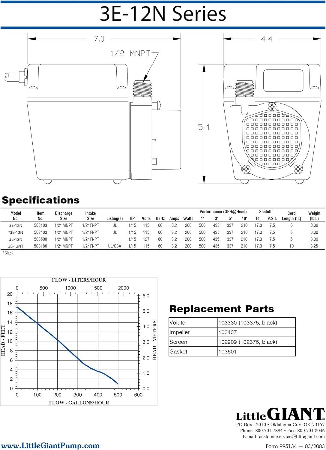 Little Giant's 3E-12N 115-Volt pump is designed for submersible or in-line use and is ideal for commercial, industrial or home uses including fountains, air conditioners, machine tool coolants, water recirculation; and water transfer. This pump comes with a 6-ft. cord with plug. This pump delivers up to 500 GPH at 1-ft. lift.