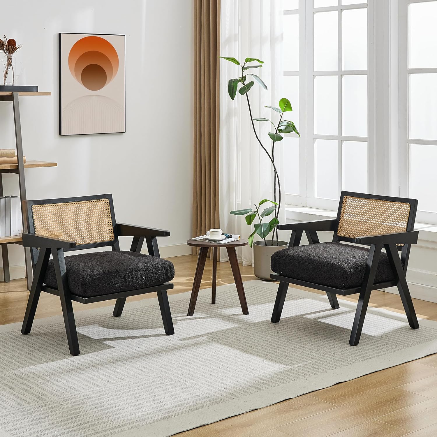 Upgrade your space with our mid century modern accent chair featuring a rattan backrest, thick cushion, and sturdy wood legs—add comfort and timeless style to your room now!Brief OverviewSink-In Softness for Everyday RelaxationClassic Mid Century EleganceRobust Wooden Base for Dependable StrengthQuick and Effortless Setup for UsersMulti-Functional Seating for Every RoomSpecificationStyle: FarmhouseFrame Material: Wood & Linen / Velvet & Rattan & SpongeColor: Beige / Gray / Black / WhiteFriendly Notice1. Assembly is required. Please check all parts are included before your installation and follow the included instructions for a smooth setup experience. Please check the chair's dimensions to ensure it fits your space and meets your comfort needs before ordering.2. For best care, avoid placing the chair in direct sunlight or exposing it to excessive dirt.3. To preserve the rattan backrest and wood finish, clean gently with a soft, damp cloth and avoid using harsh chemicals.