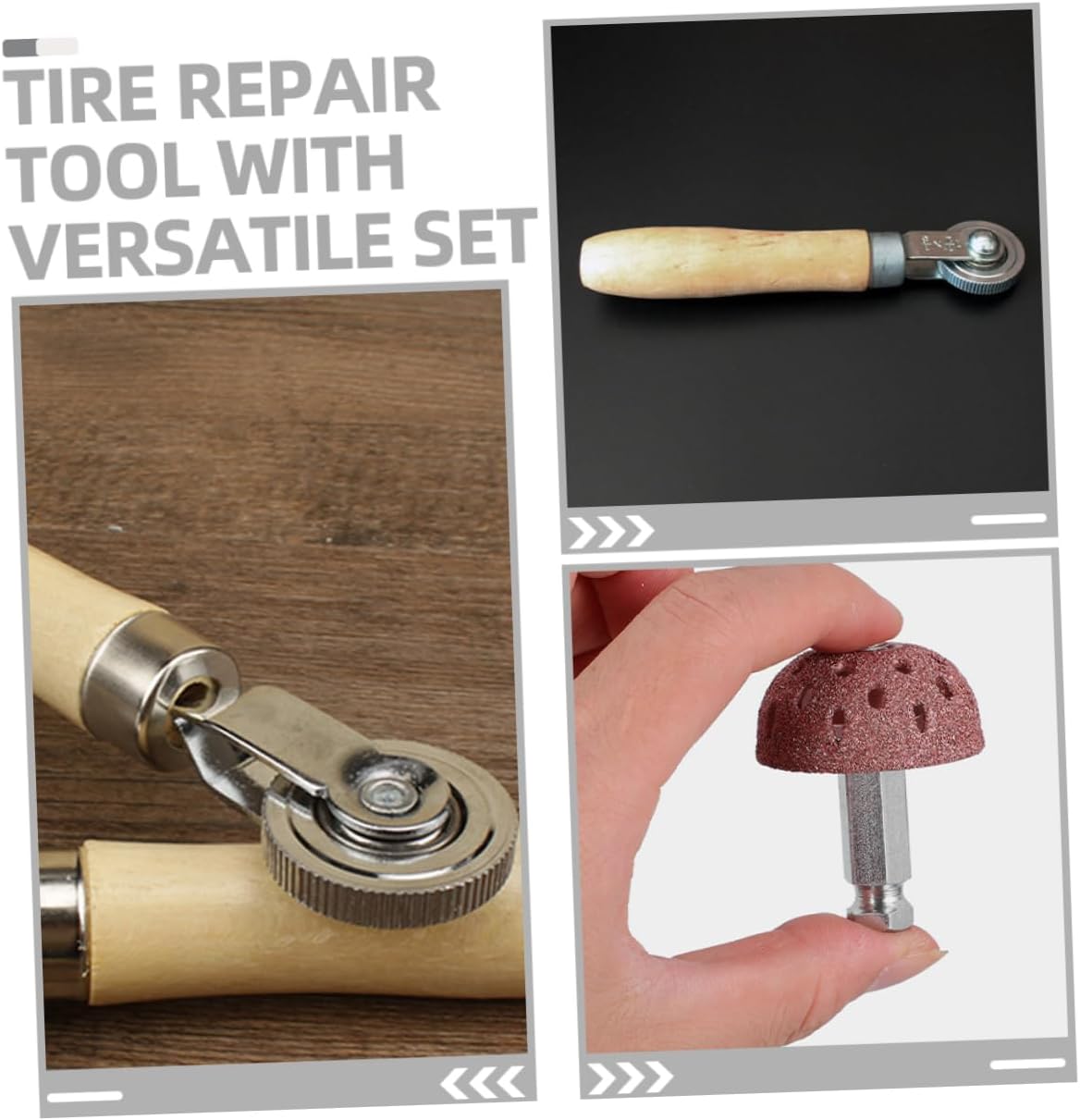 Package List 4 x roller 4 x roller head Characteristics -Color:Assorted Color Universal Tire Patch Rollers -Material:Wood,Tungsten steel alloy tire fix kit -Size:5.00X4.00X4.00cm/1.97X1.57X1.57in repair roller for tire -Size:27.00X7.00X3.50cm/10.61X2.75X1.38in tire repair plugs -Easy tire repair with wooden rake and wheel - effortless tire repair using wooden rake and wheel tire repair wheel -Smooth out rough patches with high-speed grinding head,achieve a smooth surface by using a high-speed grinding head to remove rough patches tire repair tools -Remove imperfections with bowl-shaped low-speed grinding head, flaws using a bowl-shaped grinding head that operates at a low speed motorcycle tire repair roller -Suitable for all types of vehicles , can be used on any kind of vehicle tire repair kit -Reliable quality and durability for long-term use ,ensures dependable performance and durability for extended periods of use bike tire patch kit.Goods Descriptionmotorcycle tire repair roller Whether you have a car, truck, or motorcycle, this tire repair tool set is for all types of vehicles.deadener roller tool for car The included wooden rake and wheel allow for easy tire repair, ensuring that you can get back on the road quickly.car tire tool The bowl-shaped low-speed grinding head is great for removing any imperfections, while the high-speed grinding head is for smoothing out rough patches