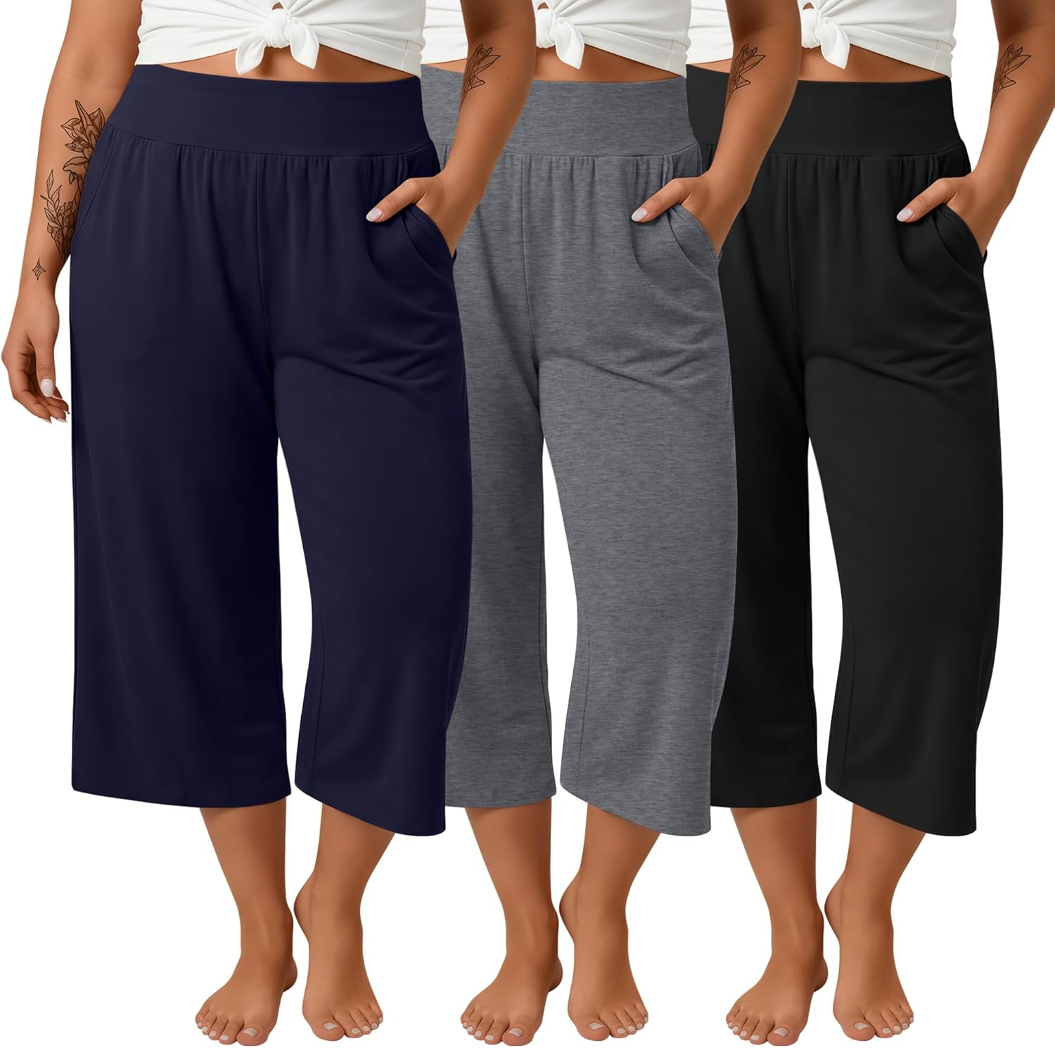 Features: Classic Colors: Available in versatile shades like black, gray, and navy blue, these women's plus size elastic waist capri sweatpants easily match any outfit for gym sessions, vacations, or cozy days indoors. Easy Clean: You can safely clean ladies plus size capri pants in your washer and dryer. We recommend washing it in cold water and either tumble drying on low heat or air drying on a line. Specifications: Material: 60% Polyester, 35% Cotton, 5% Spandex Package Includes: 3 x Plus size capri sweatpants for women Notes: Manual measurement, please allow slight errors on size. The color may exist a slight difference due to different screen displays. Please do not wash our products with other clothes, and bleaching is not allowed