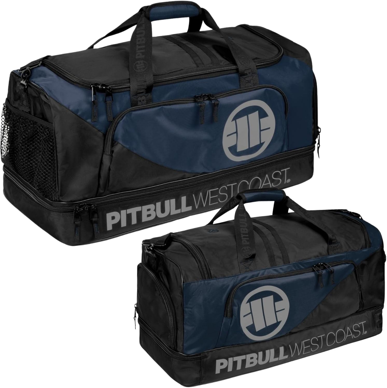 Large sports bag from PIT BULL WEST COAST - TNT Logo II - made of thick and durable nylon fabric - Jacquard handles and removable wide strap with shoulder padding - all pockets with zippers and practical Velcro closures - locks can be secured with padlocks - foldable bottom for additional storage space - additional compartment for wet clothes and shoes - robust, stable bag bottom with rubber feet - practical headphone outlet - high-quality, indelible print - Dimensions: 32 cm x 45 cm x 70 cm - Capacity: 100 L - Material composition: 100% nylon