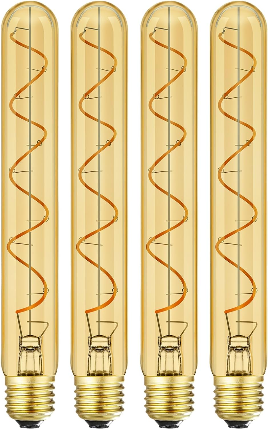 These vintage-inspired LED spiral filament bulbs from Leools offer a warm, inviting glow reminiscent of classic incandescent lighting. Featuring a unique tubular design with a swirling amber glass filament, these dimmable bulbs emit a cozy 2200K warm white light perfect for creating a nostalgic ambiance. With an E26 base and 600 lumens of brightness (equivalent to a 60W incandescent), these energy-efficient LED bulbs provide ample illumination while saving on energy costs. The pack of 4 long-lasting bulbs is an excellent choice for adding character and charm to any room in your home or business. Please note that these bulbs are not suitable for fully enclosed fixtures. promising to elevate your decor with a timeless and sophisticated touch that only the allure of amber glass can provide. ●What separates us from the competitions? ● ☑ Light up your space instantly, without any delay. ☑ CE, FCC and RoHS certified. ☑ Amber glass. ☑ Dimmable. SPECIFICATIONS: ☪ Wattage: 6W ☪ Socket: E26 ☪ Size:7.3*1.2*1.2inch ☪ Voltage: 120V AC ☪ Lumen output: 600LM ☪ Color temperature:2200K (Amber Warm White) ☪ CRI: >90+ ☪ Box included:4 x6W T30 LED Light Bulb. Cautions: 1. Switch off the power before replace the lamp 2. Keep away from direct sunshine and too high temperature. 3. Indoor use only. 4. If any doubt about the installation or use of this product, please consult a competent electrician. 5. If you are not 100% satisfied with your purchase or there is any damage in transit we will make it right.We are committed to responding to any request within 12 hours.